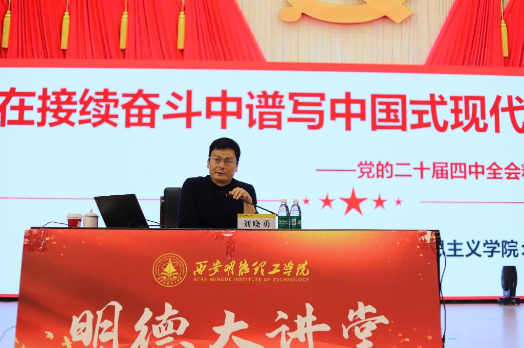 2025年11月17日,开元第81期“明德大讲堂”在四季廊桥报告厅隆重举行。本次讲座邀请到宝鸡文理学院马克思主义学院院长刘晓勇教授作题为“在接续奋斗中谱写中国式现代化新篇章——党的二十届四中全会精神专题辅...