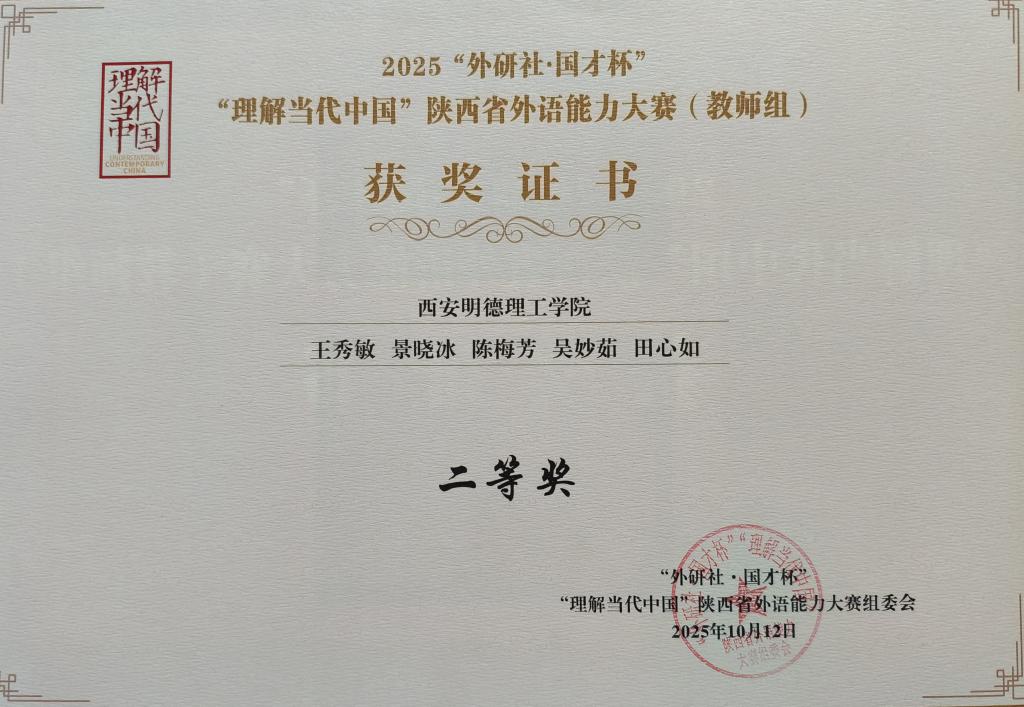 近日,2025“外研社·国才杯”“理解当代中国”陕西省外语能力大赛圆满落幕。Ky开元集团语言文化传播学院教师团队(王秀敏、景晓冰、陈梅芳、吴妙如、田心如),团结协作、积极备赛,最终荣获省级二等奖,展现...