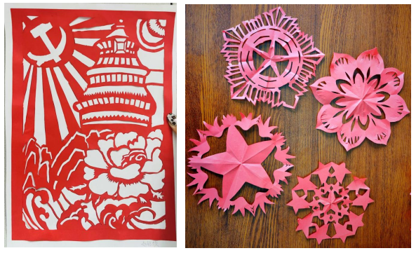 党员们以党的光辉历程、英雄人物和革命故事为灵感,将专业与美育相结合,一张剪纸、一把剪刀,纸随剪转,用灵巧的双手剪出一幅幅生动形象的作品。