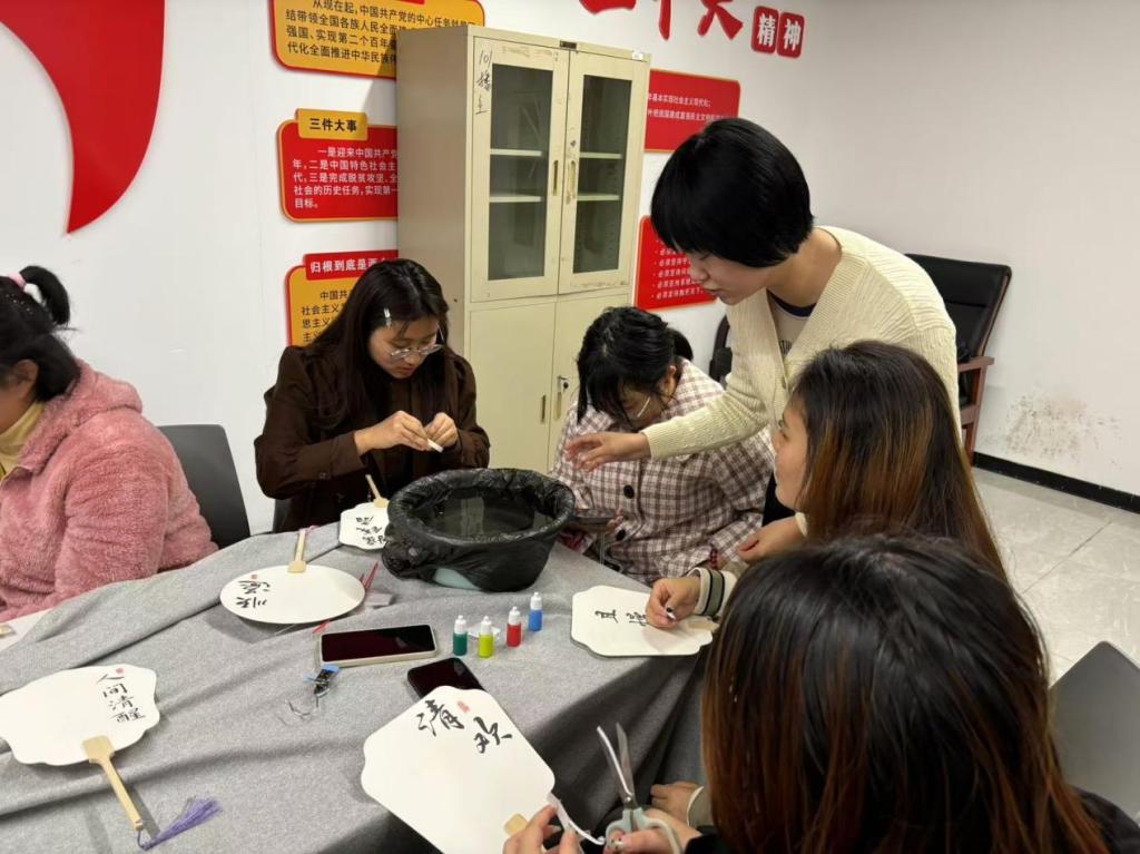 为加强和改进新时代学校美育工作,赓续文化血脉,将爱国主义教育与以美育人、以美化人、以美培元有机结合,在提升青年学生审美与人文素养的同时,厚植爱党、爱国、爱人民情怀。11月17日,经济与管理学院学生第四党支部在桐苑“一站式”学生社区开展强国复兴有我美育实践活动,支部党员、发展对象代表参加了活动。此次活动聚焦编中国结、剪纸、漆扇传统手工技艺,旨在引导学生们深入挖掘和传承中华民族优秀传统文化,为实现中华民族伟大复兴注入文化力量。