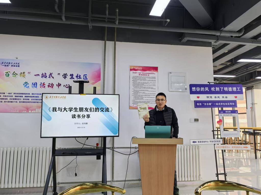 “与师为友、与书同行”,为进一步丰富校园文化生活,营造浓厚的书香氛围,12月24日上午,学校在百合楼“一站式”学生社区党团活动中心组织开展“我与大学生朋友们的交流”师生读书分享会——师生共读一本书《我与大学生朋友们的交流》。