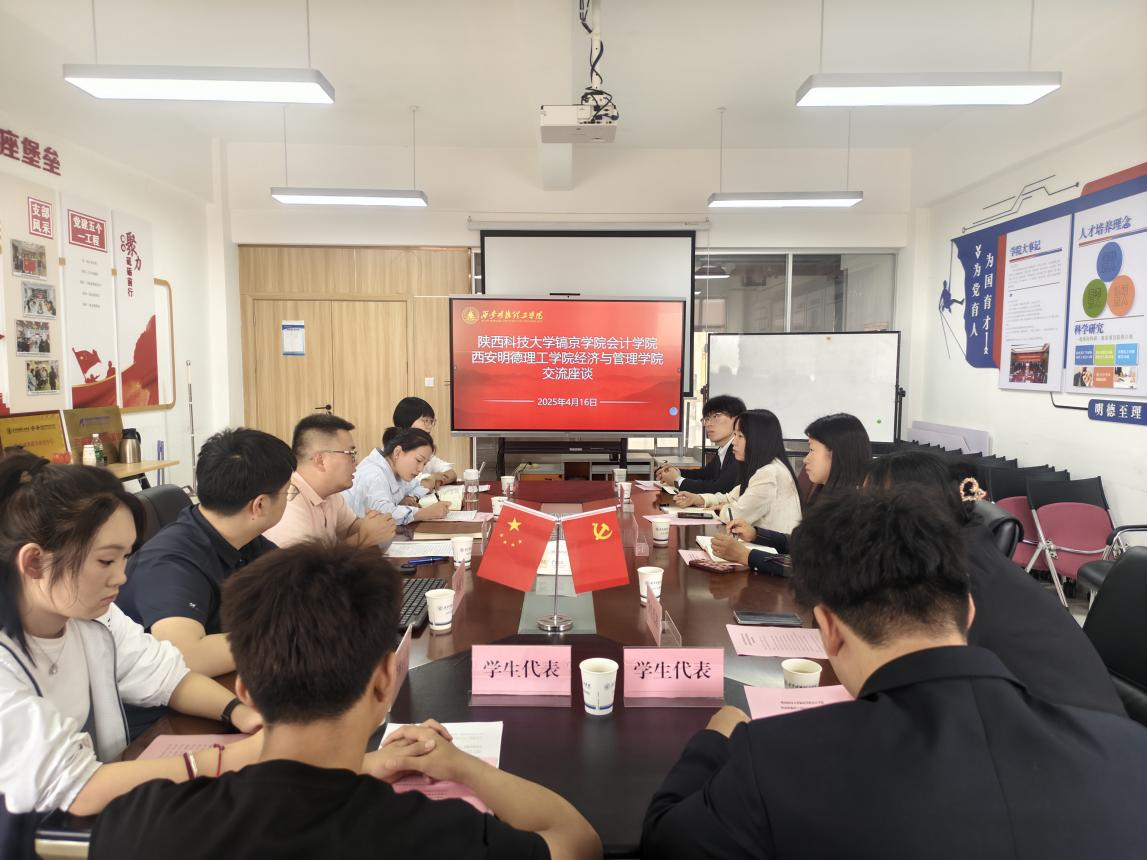 韩雅轩副院长对学院的热情接待表示感谢,介绍了陕西科技大学镐京学院会计学院的学生工作基本情况及党建工作情况。随后双方就新时代如何开展好学生工作展开交流讨论,分享人才培养中的经验、做法,互相学习借鉴。双方表示,将以此次交流为契机,拓宽交流互鉴渠道,推动学生工作走深走实。