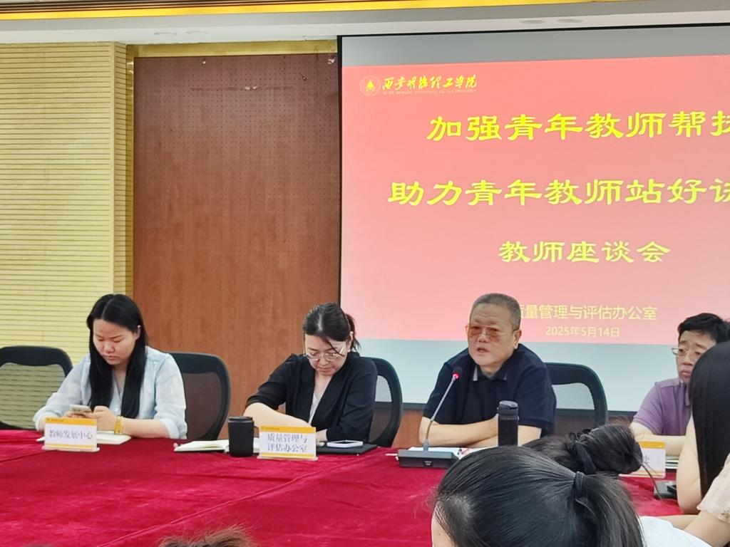 为进一步加强青年教师帮扶工作,助力青年教师站稳讲台、提升教学水平,2025年5月14日,质量管理与评估办公室组织召开2024-2025学年第二学期教师座谈会。会议由质评办李海峰教授主持,教务处文亮副处长、校级教学督导代表马焱、赵凌珺、各二级学院41名教师代表,教师发展中心、质评办相关人员参加了会议。