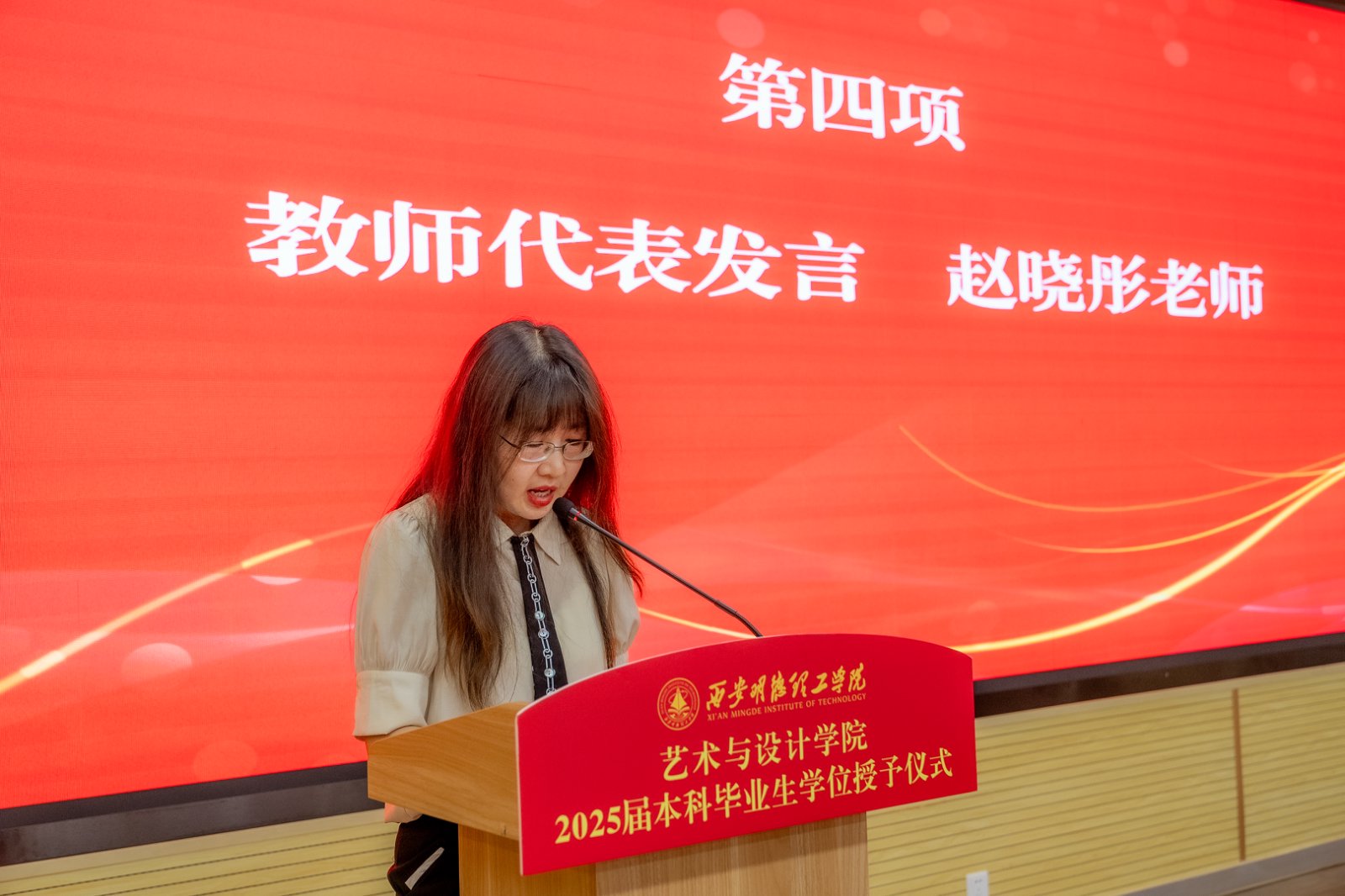 教师代表赵晓彤老师发言,表达了对毕业生们的肯定和期许,鼓励同学们在未来的道路上继续努力,追求卓越。