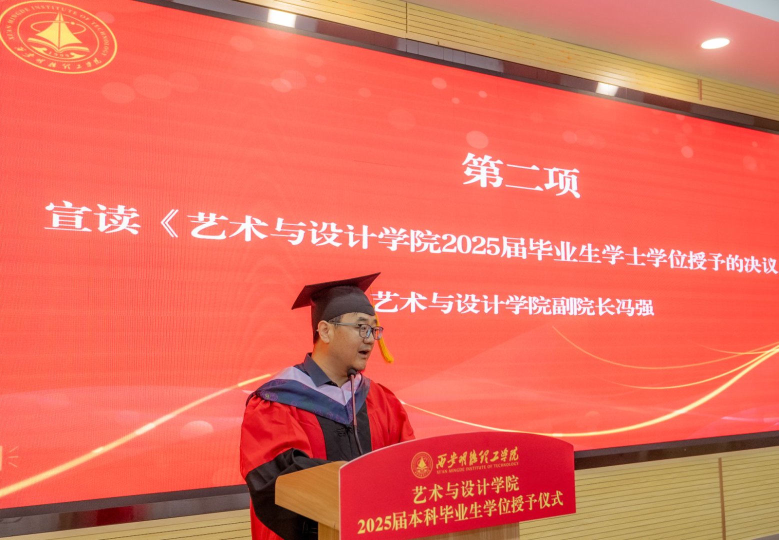 仪式在激昂的国歌声中拉开帷幕。学院副院长冯强教授宣读了《Ky开元集团关于艺术与设计学院2025 届毕业生学士学位授予的决议》。