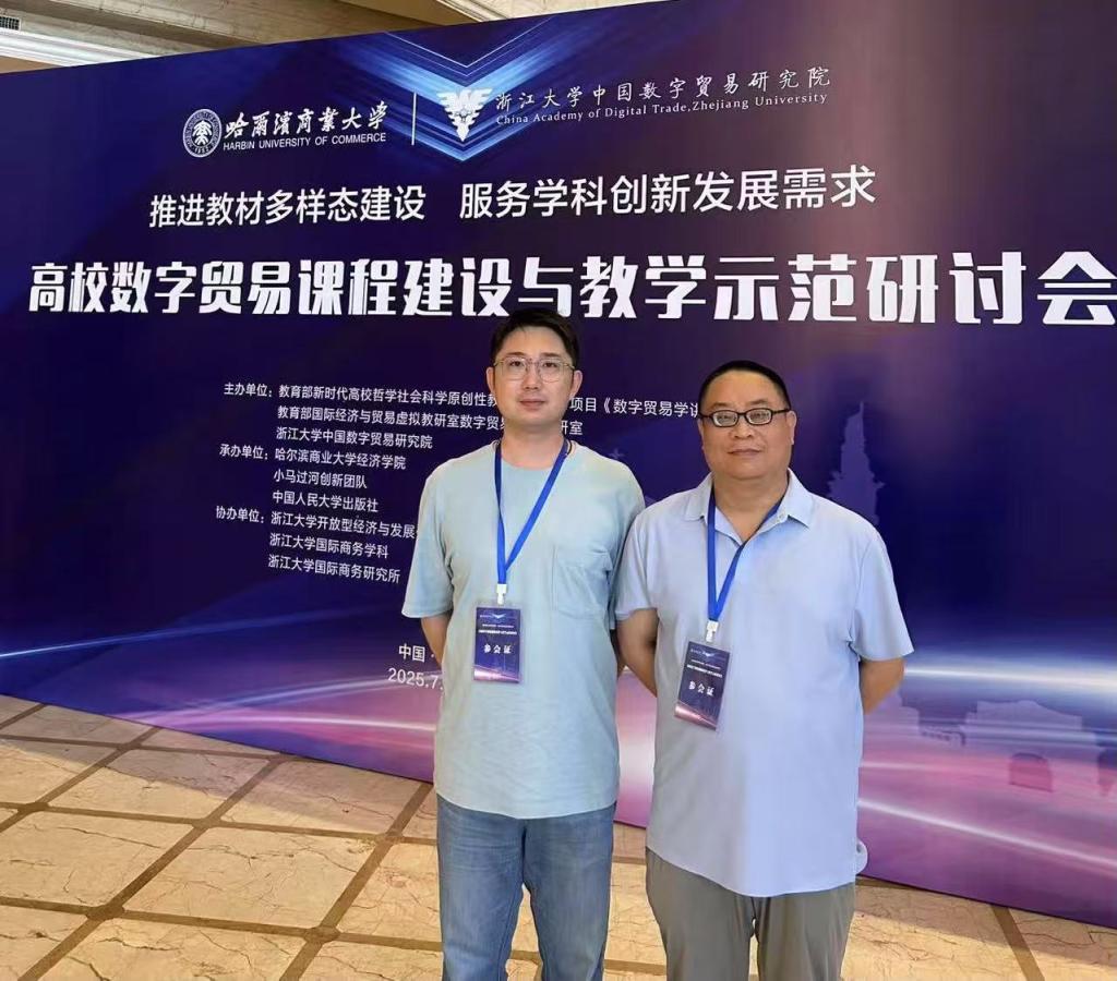 7月18-20日,由教育部新时代高校哲学社会科学原创性教材建设培育项目《数字贸易学讲义》课题组、教育部国际经济与贸易虚拟教研室数字贸易虚拟教研室联合主办,浙江大学中国数字贸易研究院与哈尔滨商业大学经济学院共同承办的“高校数字贸易课程建设与教学示范研讨会”在哈尔滨举行。本次会议汇聚了来自全国近百所高校的逾200位专家学者及骨干教师,围绕“服务学科创新发展需求,推进教材多样态建设”的主题展开研讨。经济与管理学院国际经济与贸易专业负责人王维新教授、骨干教师刘瑞阳应邀参会,通过观摩学习与交流互动,两位教师拓宽了专业建设的视野与思路,学习了兄弟院校在数字贸易教育领域的宝贵经验。