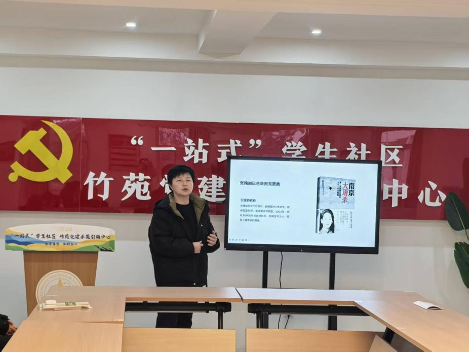 马克思主义学院张乐老师以《南京大屠杀:第二次世界大战中被遗忘的大浩劫》为主题,深情分享了美籍华裔作家张纯如的纪实著作。张乐从历史背景、著作意义与当代启示三个维度展开讲述,指出张纯如不仅以严谨的笔触还原了南京大屠杀的历史真相,更以生命为代价唤醒了世界对这段黑暗历史的关注。她强调,铭记历史不是延续仇恨,而是为了捍卫和平与正义,防止悲剧重演。“张纯如的写作,是一盏照亮黑暗的灯,”张乐说,“它提醒我们,个体的勇气与良知如何成为对抗遗忘与扭曲的力量。”她鼓励青年学子以史为鉴,在深刻理解民族苦难的基础上,筑牢历史责任感,成为维护真理、珍视和平的时代新人。