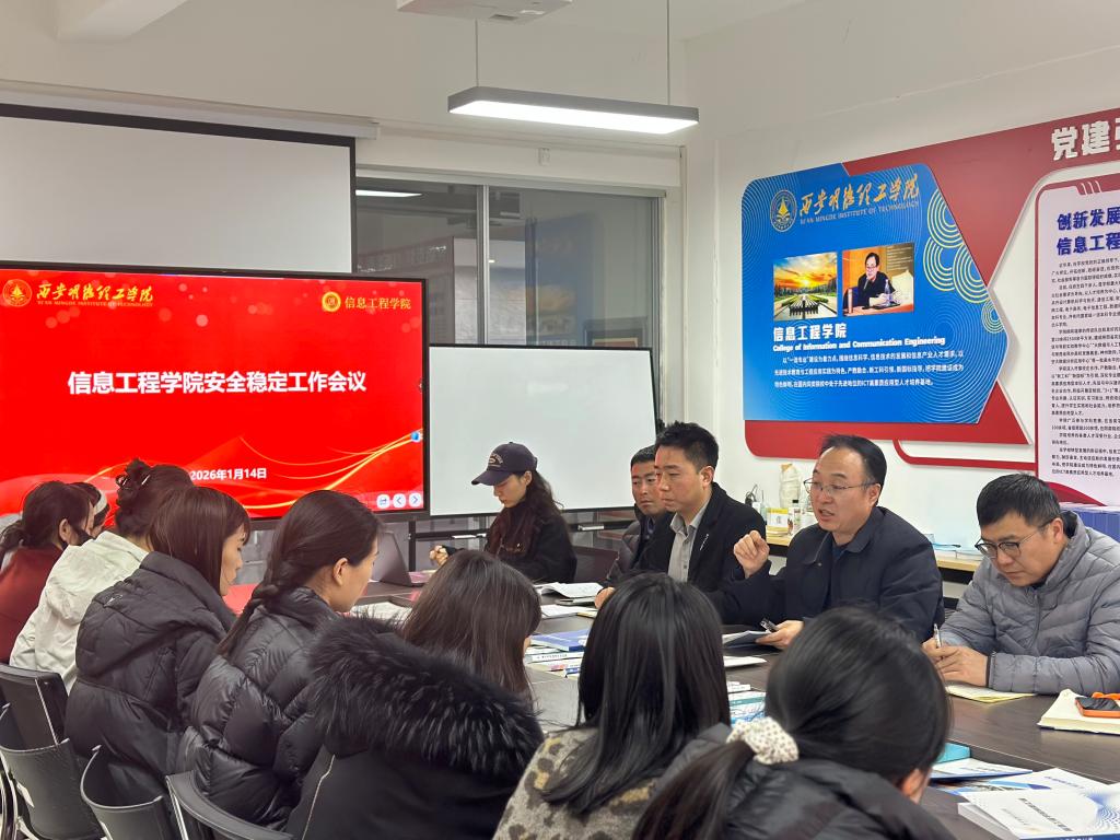 为进一步筑牢岁末年初校园安全稳定、学生平安返乡基础,确保全体学生度过一个平安、祥和、充实的假期。2026年1月14日,信息工程学院召开全体辅导员安全稳定工作会议,专题部署期末及寒假期间学生安全管理工作。学院党委书记肖千春主持会议并讲话,传达了省教育厅教育系统安全稳定工作会议精神,结合期末教学安排和学生寒假离校返乡实际,对全体学工干部提出明确工作要求。全院学工干部参加此次会议。