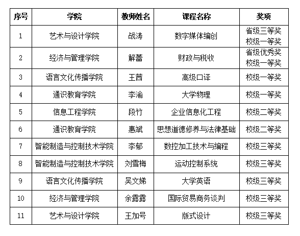 1月7号上午,由教务科研部组织的陕西省第三届高校课堂教学创新大赛(本科)校级初赛颁奖仪式在明志楼311报告厅落下帷幕,我院艺术与设计学院的战涛老师等4位教师获得校级一等奖,信息工程学院段竹老师等2位教师获得校级二等奖,智能制造与控制技术学院李郁老师等5位教师获得校级三等奖,教师获奖名单如下: