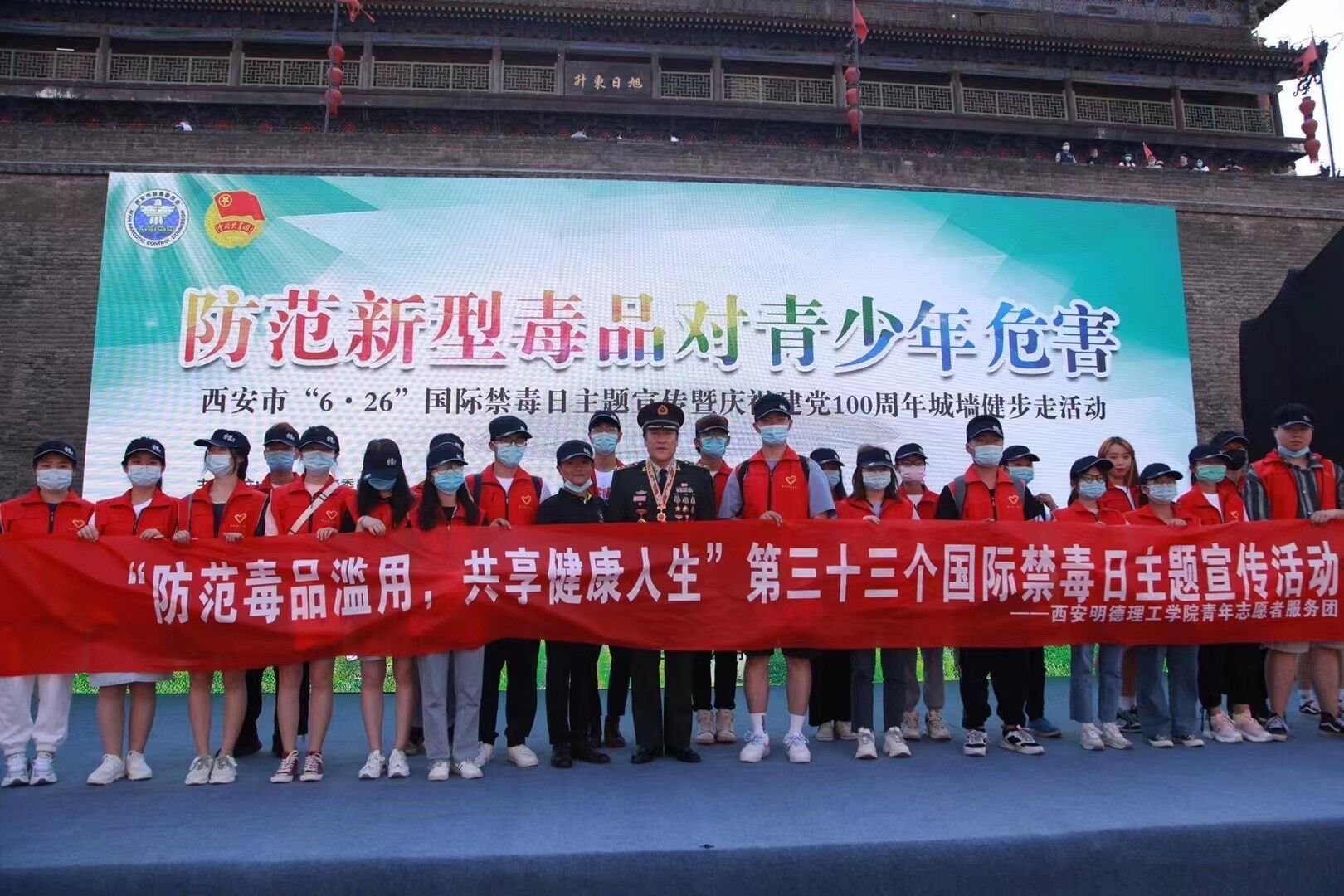 6月22日,由西安市禁毒委员会、共青团西安市委主办,西安市禁毒委员会办公室、西安志愿者协会承办的,6.26国际禁毒日“防范新型毒品对青少年危害”主题宣传暨庆祝建党100周年“城墙健步走”在西安市城墙东门瓮城开展。市政府副秘书长、市禁毒委副主任肖争光,市禁毒委副主任、市禁毒办主任、市公安局副局长魏重光,团市委副书记徐辉、市禁毒委各成员单位相关领导参加活动。开元青年30余名志愿者受邀参加活动。