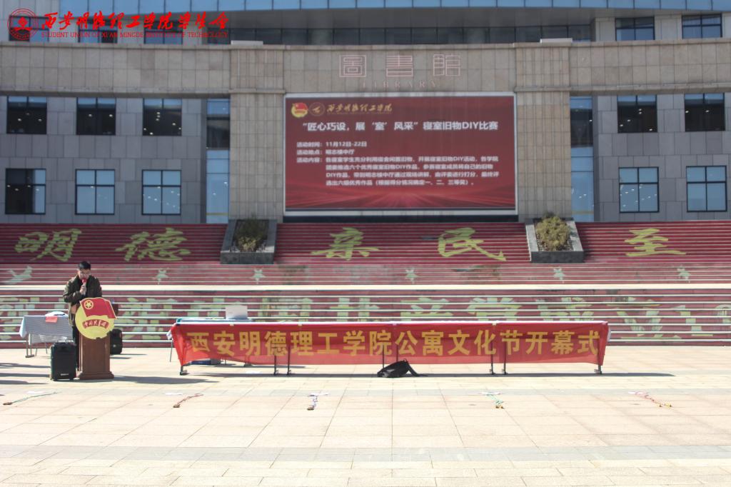 开幕式伊始,校团委刘雄老师宣读了《关于开展公寓文化节的通知》,本次公寓文化节包括“‘寝’近生活,定格美好”寝室生活Vlog征集活动 ;“‘寝’投意合,‘室’情画意”寝室装饰活动;“匠心巧设,展‘室’风采”寝室旧物DIY比赛 ;“爱拼才会赢”跳大绳比赛 ;“我心中最美的阿姨”系列评选活动 ;以及“寓’见心安”寝室建设意见座谈会等六个系列活动。