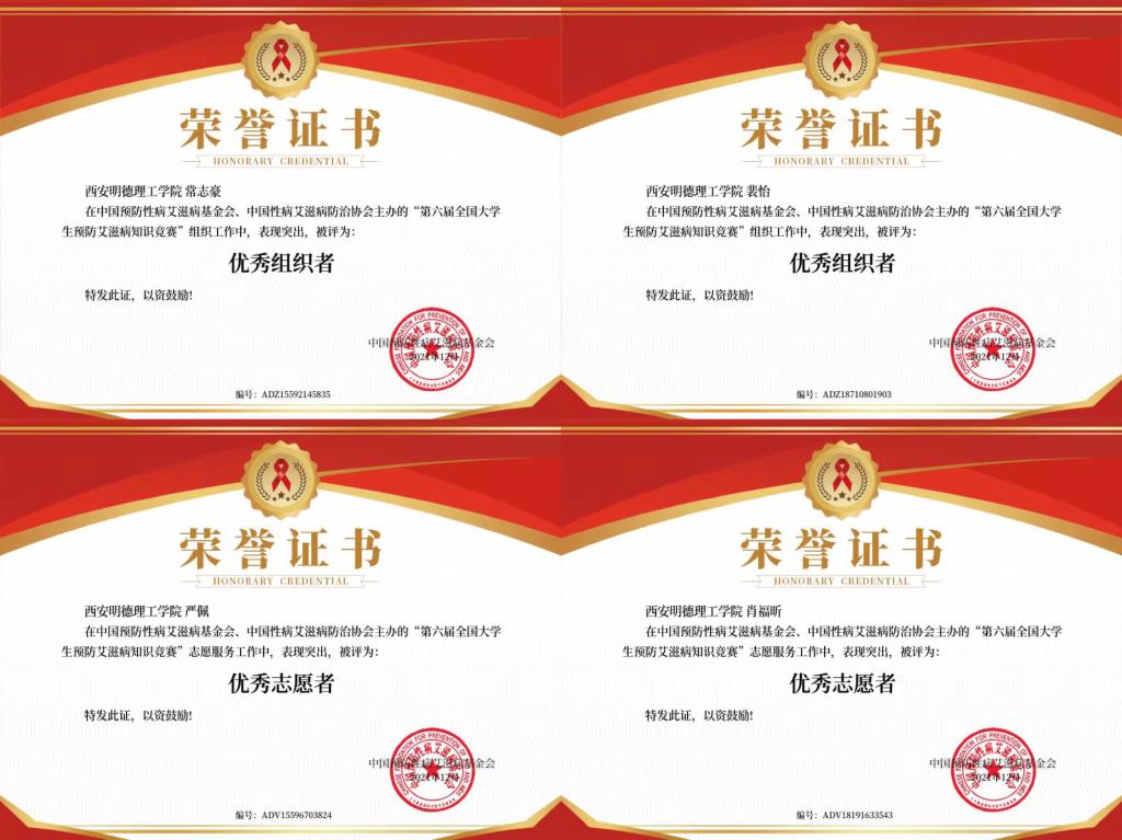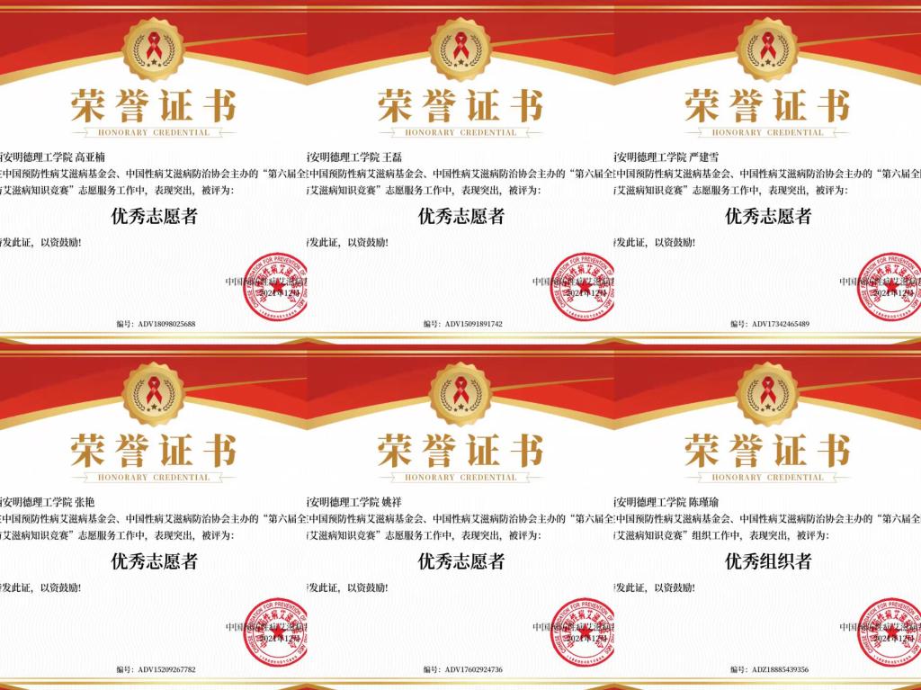 为落实《“健康中国2030”规划纲要》,进一步推进艾滋病防治工作,践行《中国遏制与防治艾滋病“十三五”行动计划》中关于“持续加强重点人群宣传教育”以及“积极发挥学生社团、青年志愿者等的作用,2021年,开元青年志愿者服务团承办了由中国预防性病艾滋病基金会、中国性病艾滋病防治协会主办的“第六届全国大学生预防艾滋病知识竞赛”,学校956位同学积极参赛,取得了良好的成绩,其中开元青年志愿者服务团被评为“优秀承办单位”,校团委刘雄荣获“优秀指导教师”称号,陈瑾瑜等3人荣获“优秀组织者”称号,严建雪等7人荣获“优秀志愿者”称号。