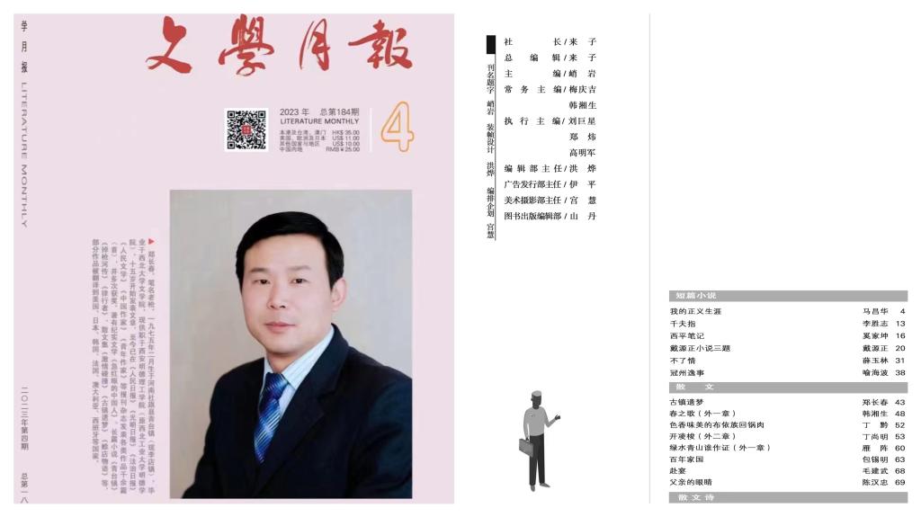 日前,开元党委组织宣传部郑长春老师荣登2023年第4期《文学月报》杂志封面人物,当期杂志还配发了他近万字的散文佳作《古镇遗梦》。