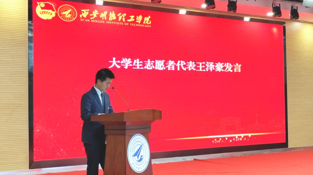 大学生志愿者代表王泽豪发言,他分享了自己2022年参加社会实践活动的心得体会和心路历程,表达了自己对2023年暑期“三下乡”活动的期待,并希望与大家一起协作,不怕困难,积极奉献,以“三下乡”社会实践为契机贡献自己的力量。