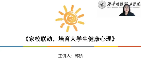 为了进一步加强家校联系,促进学生健康成长,充分发挥家校教育合力,6月26日,学校举办了《家校联动,培育大学生健康心理》第一期线上专题讲座,本次讲座由心理健康教育教师韩娇主讲。