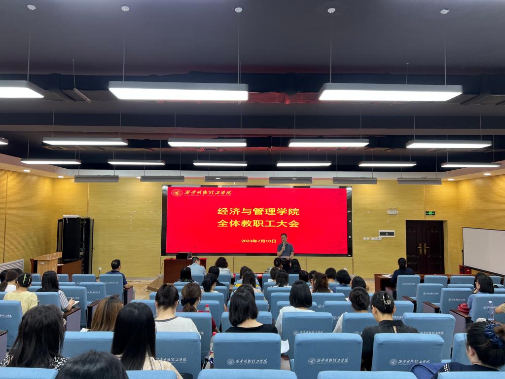 7月10日上午,经济与管理学院在建德楼202召开全体教职工大会。会议由学院党委书记兼行政副院长何文举主持,人力资源处副处长康抗、经济与管理学院院长郭鹏教授、副院长许萍、雷娟、金融产业学院副院长刘敏及全体教职工参加大会。
