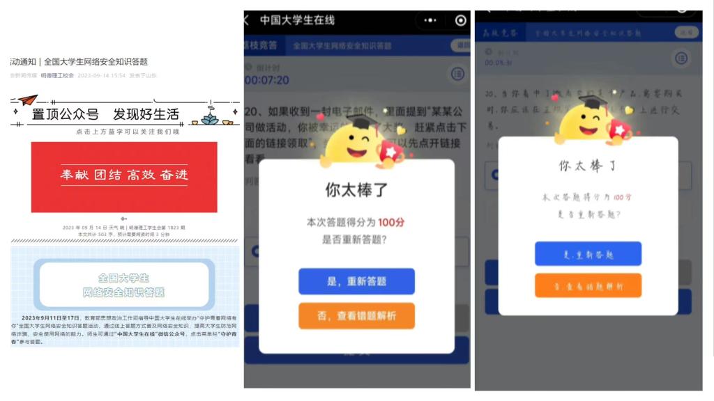 组织学生参加教育部思想政治工作司指导中国大学生在线举办“守护青春网络有你”全国大学生网络安全知识答题活动,通过线上答题方式普及网络安全知识,提高大学生防范网络诈骗、安全使用网络的能力。