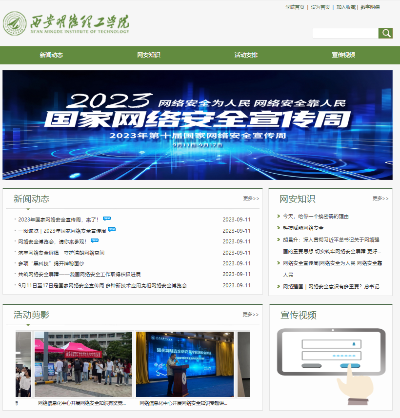 2023年国家网络安全宣传周于9月11日至17日在全国范围内开展。为进一步提升国家网络安全宣传周宣传覆盖面和影响力,营造浓厚的网络安全宣传氛围,普及网络安全知识。学校紧紧围绕“网络安全为人民,网络安全靠人民”主题,在全校范围内开展了形式多样的宣传活动。