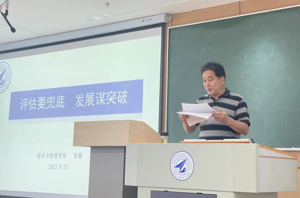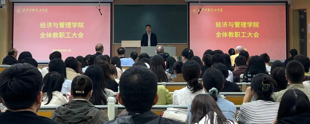 2023年9月27日中午经济与管理学院在7号教学楼602召开2023-2024学年第一学期全体教职工大会,会议由学院党委书记何文举主持。经济与管理学院院长郭鹏教授、副院长许萍、雷娟,金融产业学院副院长刘敏及学院教职工参加大会。