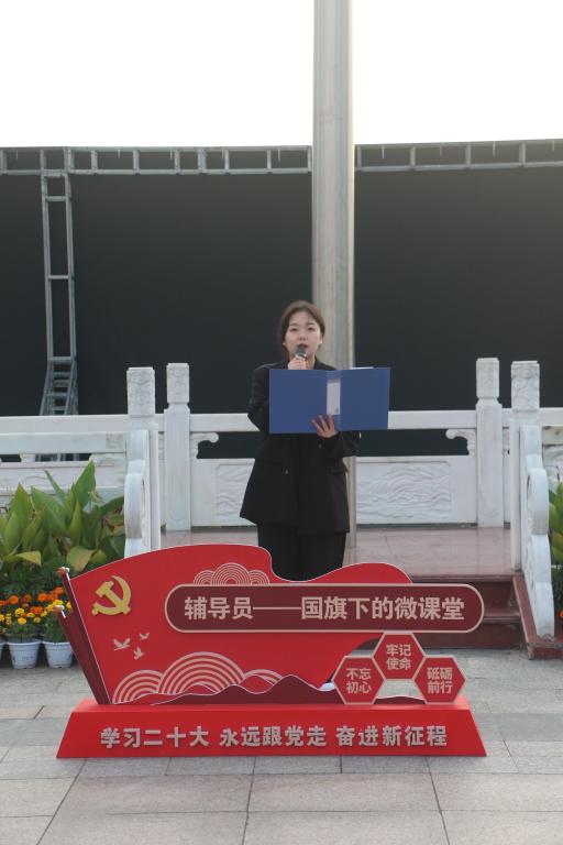 智能制造与控制技术学院2022级辅导员赵晨琛进行了主题为《以青春之我,担时代之责》的国旗下微课堂,她讲到:我们生在红旗下,长在春风里,目光所至,皆为华夏;五星闪耀,皆为信仰。在不同的时代下,爱国有着不同的内涵。自古以来,心怀国家的有志之士,他们正是国家的脊梁。革命时期,仁人志士“白眼观天下,丹心报国家”,以己之力投入到变革的浪潮中;和平年代,爱国是“筑建中国梦的基石”,我们更应将自己的青春奉献给伟大事业,无论何时,青年学子都应怀有天下兴亡匹夫有责的责任感,正处风华正茂的我们,当怀丹心启航新征程。以青春之我,担时代之责!