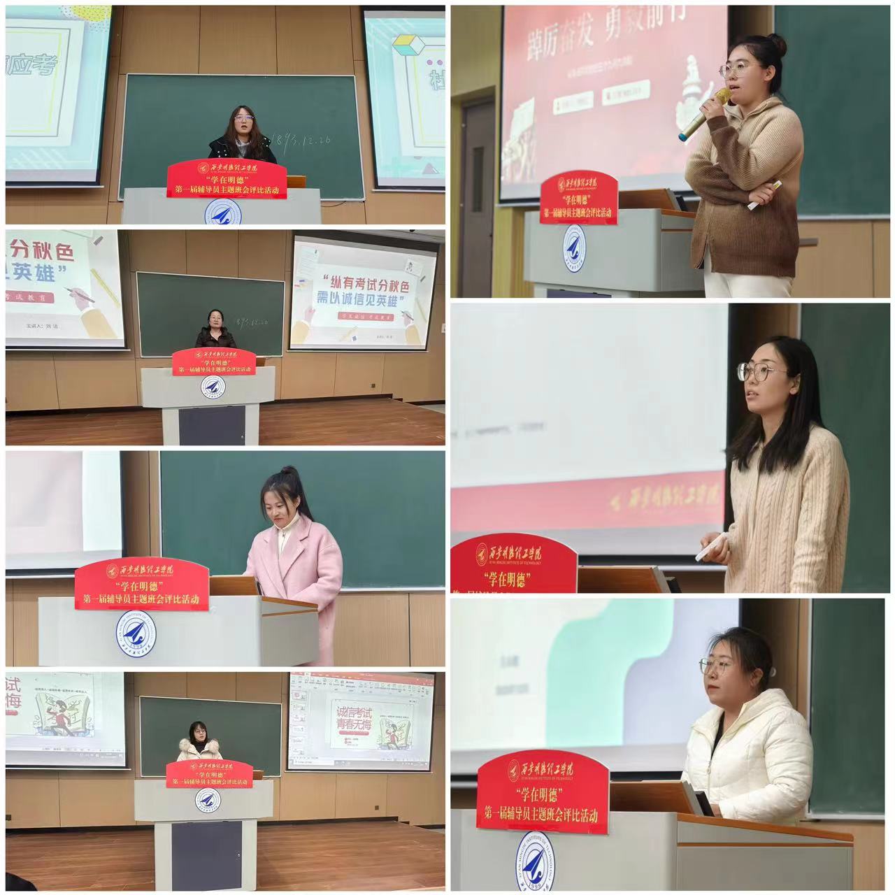 为办好此次评比活动,学院前期召开专门会议进行动员。全体辅导员积极参与,推选出7名辅导员进行院内初步评选,内容包括班会教案设计及班会课现场展示。参赛辅导员精心准备,认真设计,立足学生管理日常,从“大学生就业指导”“诚信考试教育”“理想信念教育”等主题开展班会。通过师生互动、注意力集中小游戏、诚信考试宣誓、图文视频结合,理论联系实际等生动丰富的形式全面展示自身综合素质能力。