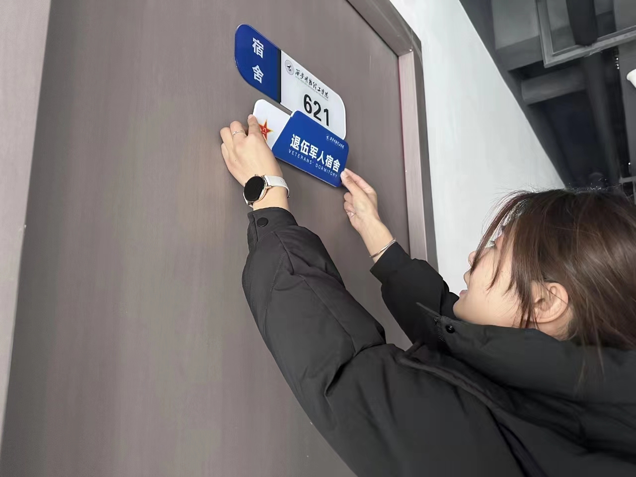 退伍学生宿舍挂牌活动,鼓励退伍学生亮明身份、勇于当担、争做榜样,增强了退伍军人的使命感、荣誉感、归属感,调动了退伍军人参与学校精神文明建设的积极性,为学校全面建设和发展集聚了正能量。