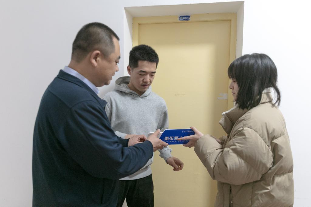 挂牌活动中,领导和老师们走进退伍学生宿舍,仔细查看住宿情况、详细询问退役复学后生活、学业等方面的情况,希望他们保持发扬军人优良传统和作风,发挥退伍军人榜样引领、模范带头作用,争做学习型宿舍的创建者、文明型宿舍的示范者、和谐型宿舍的引领者和国防宣传教育的推动者。退役学生们纷纷感谢学校各级领导和老师们,从参军入伍到退役复学热情地为他们做好各项服务和保障工作,让身为明德学子的他们感到格外温暖和自豪。学校现在为退伍学生宿舍挂牌,这不仅是一份荣誉信任,更是一份责任担当。表示在今后校园的学习生活中,作为退役复学的一份子会更加珍惜荣誉,严格自律,作好表率,当好模范,用自己的言行影响和带动身边的同学,共同建设文明有序、温馨舒适的宿舍环境,为国防教育宣传和文明校园、平安校园、绿色校园建设贡献更大力量。