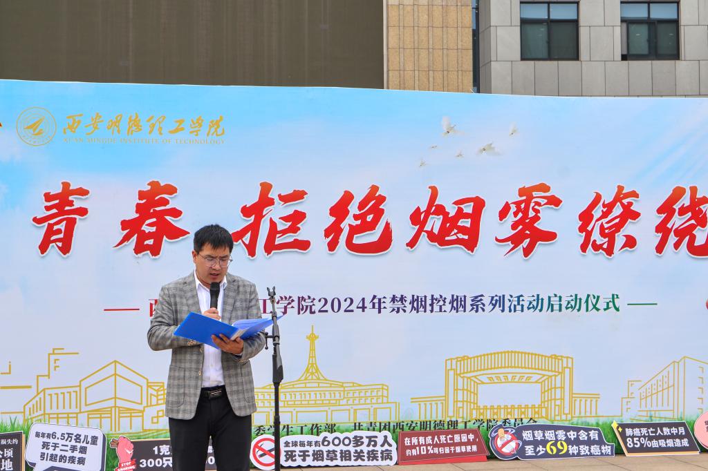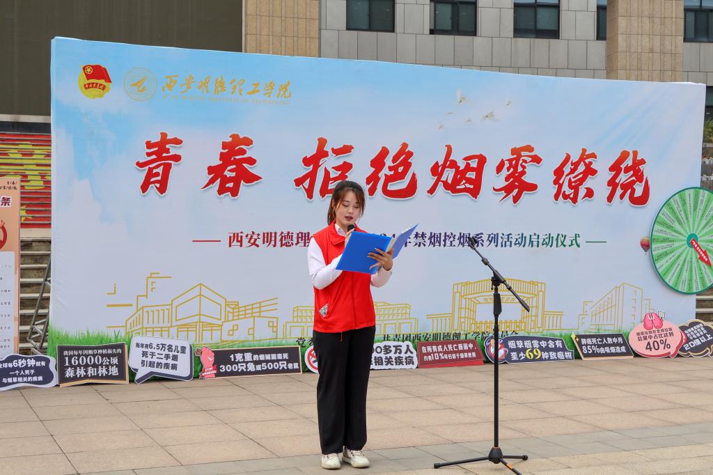 学校禁烟控烟学生倡导者、青年志愿者代表董宁萱宣读《禁烟控烟倡议书》,一是自觉远离烟草,珍爱身体健康;二是树立禁烟意识,共建无烟校园;三是加强自我管理,互相监督提醒;四是倡导文明健康,加强宣传引导。他深情呼吁同学们一起行动起来,为禁烟控烟工作深入到师生的心中尽一份心,为明德理工的文明校园称号行稳致远出一份力!为建设无烟校园、控烟明德贡献自己的力量!