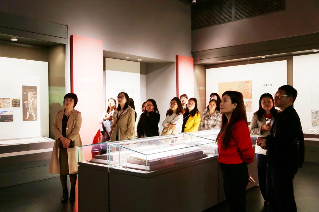 进入馆内,在讲解员的带领下,大家绕过文济池,拾阶而上,依次参观了1800平米的巨大书墙,文济阁展厅及结合陕西文化特色精心设置的“楮墨遗珍·万里同风——丝绸之路版本展”和“赓续文脉·踔厉前行——中华文化经典版本展(西部篇)”两个展厅。展厅内各种文献典籍、雕塑绘画、珍贵图片及手稿等版本资源生动展现了千年丝路文明、中华民族文化根脉、延安精神及以西部为主的中华优秀传统文化脉络。馆员们真切感受到中华文化的深厚底蕴、民族精神及家国情怀,完整了解了中华文明记录、保存、赓续、传播与更新的历程。