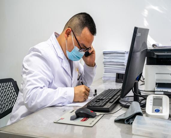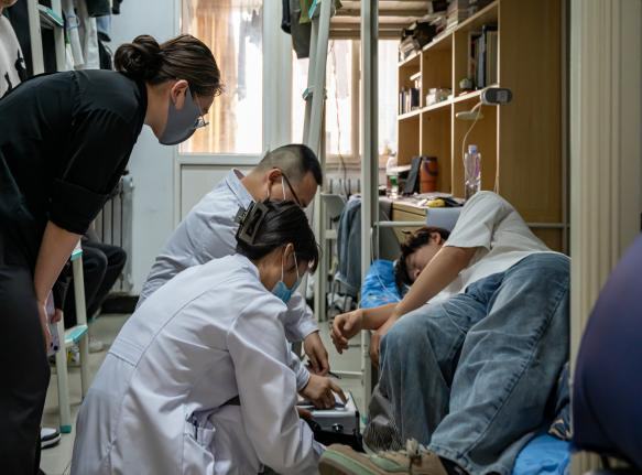 4月26日上午,伴随着一声声急促的电话铃声,明康医院值班医生接到来自桃苑南学生公寓235室一位学生的急救电话,医护人员在简单了解学生病情后,迅速携带相关医疗用品搭成巡逻车前往桃苑学生公寓展开急救。