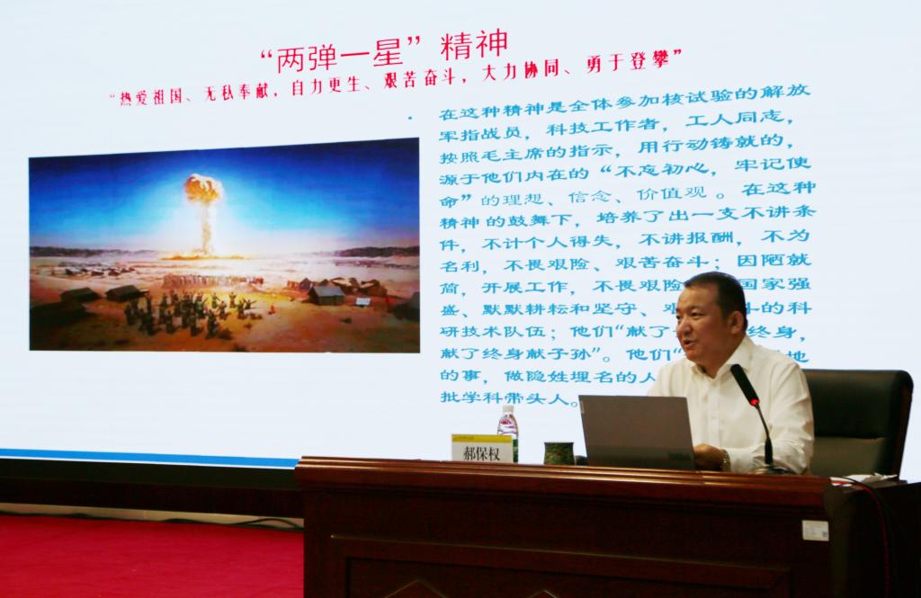 在本次讲座中,郝教授通过大量例证与史料,依次从“两弹一星”的起源、原子能和平利用、原子弹研制过程、“两弹一星”精神等方面,生动形象地讲述了建国初期参与“两弹一星”的人员不讲条件、不计个人得失,不计名利、不畏艰辛、艰苦奋斗的感人故事。“两弹一星”精神是热爱祖国、无私奉献,自力更生、艰苦奋斗,大力协同、勇于登攀,是在二十世纪五、六十年代中国科学家在研制“两弹一星”过程中形成的,凝聚着科技工作者报效祖国的满腔热血和赤胆忠心,反映了他们坚定的理想信念和崇高的精神境界,是新时期推动我国社会主义建设事业不断发展的强大精神力量。