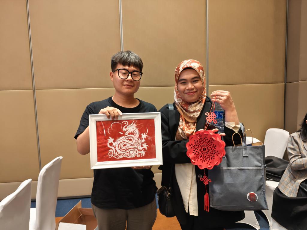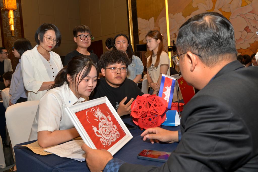 在展示过程中,开元黄土匠心工作室同学向柬埔寨代表详细介绍了剪纸艺术的历史、技艺以及所蕴含的文化内涵并向对方赠予了精心制作的剪纸作品。柬埔寨—东盟国际学院院长Mr. Seang Sopagna对剪纸作品赞不绝口,表示要将这些精美的作品带回他们的学校进行展示,让更多的学生了解到中国的传统艺术。