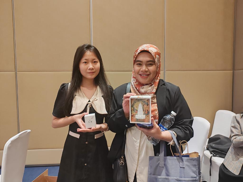 来自开元的西安霄麟文化创业有限公司团队的同学向马来西亚代表努尔•赛里尼•萨希米介绍了具有西安地标性的香薰产品,他们从西安历史文化、地方特征以及香薰的制作工艺等多方面介绍了香薰的由来。马来西亚代表对香薰的“香”表示了深刻的赞同,认为这种“香”是独一无二,并且具有西安地方特色的气息。