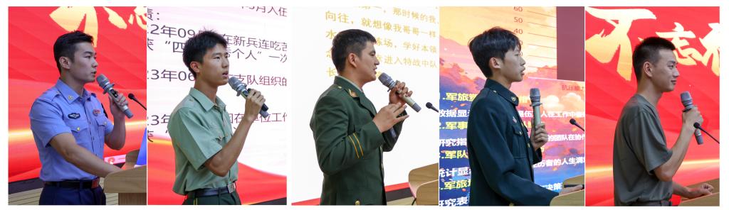 杨文博介绍了活动的目的和意义,强调了传承军人精神、培养家国情怀的重要性。随后,五位退伍士兵代表依次上台,分享了他们从校园到军营、从青涩学子到优秀军人的成长历程。