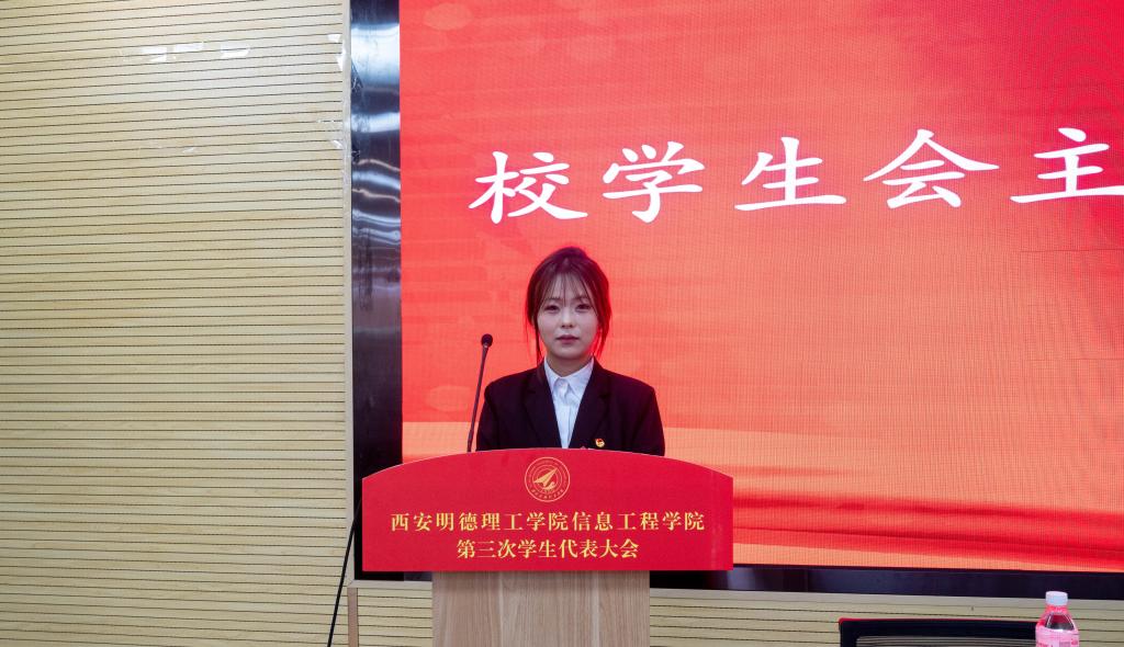 大会伊始,校学生会主席团成员王郑新迎致辞。她鼓励信息工程学院全体学生以本次大会为新的起点,把握时代赋予的机遇,迎接未来的挑战,共同推动信息工程学院和整个学校朝着既定目标稳步前进,为建设特色鲜明、国内一流、具有国际影响力的应用型民办大学贡献青春力量。
