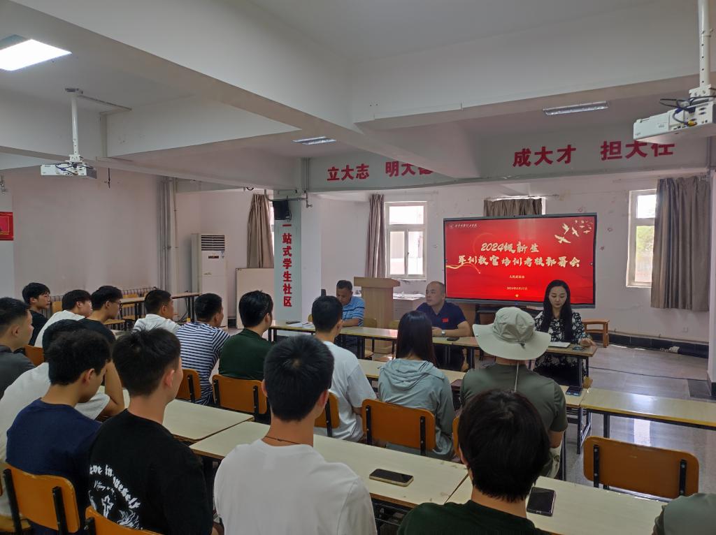 会上,童杨梓介绍了2024年开元将首次采取“自训+帮训”的新生军训新模式,安排了学生军训教官的培训考核工作,就学生军训教官关注的问题进行互动答疑和交流探讨,最后对参加培训考核的退伍在校学生们提出了几点要求:一是要提高思想认识,充分认识学校新生军训工作的重要意义和此次培训考核的必要性,以积极认真的姿态投入到培训考核中;二是要继承发扬部队优良传统,练就过硬本领,通过培训提升自己的军政素质,预祝同学们通过考核成为一名合格的高校军训教官;三是要严守带训纪律,以身作则,通过参加新生军训等重大活动为学校建设发展贡献青春力量,擦亮退役学生这张名片。同学们表示一定会端正思想认识,以饱满的热情,全心全意地投入培训;发扬吃苦耐劳的精神刻苦训练,不断提高自身的带训能力;严格遵守培训考核规定要求,在带军训任务中以教官的身份要求规范自己的言行,做到服从命令听从指挥,为学校军训任务的圆满完成贡献退伍学生应有的力量。