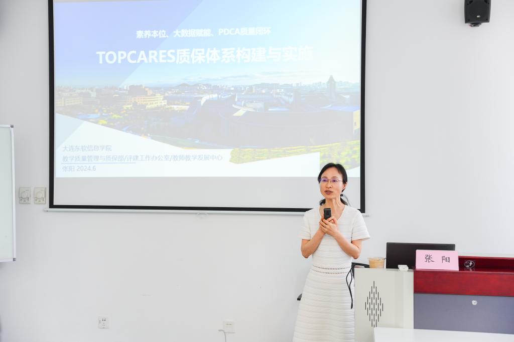 6月30日下午,大连东软信息学院计算机与软件学院副院长,计算机与人工智能系主任、教授张阳带来第五讲“TOPCARES质量保证体系构建与实施”。她强调了以学生为中心的教学理念,讲解了如何通过教学评估、教师发展、课程改革等措施提升人才培养质量。同时强调了学生评价教师的重要性以及如何利用数据和评价反馈来提升教学质量。老师们通过学习认识了教师发展和教育质量提升对学校整体发展的重要性。