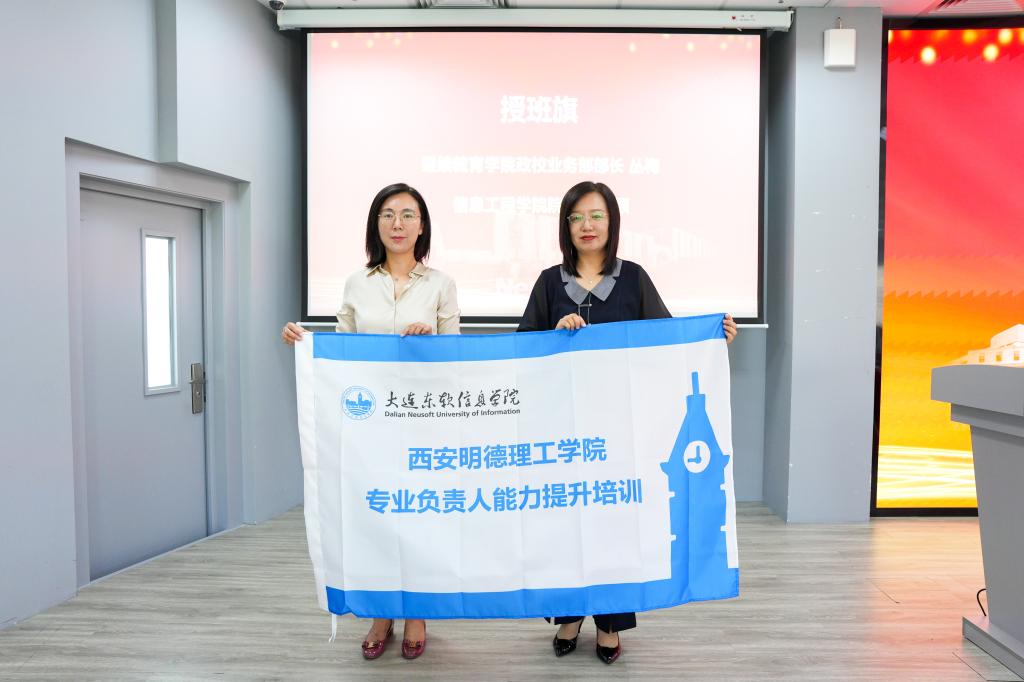 大连东软信息学院继续教育学院政校业务部部长丛梅将本次培训班班旗授予翟书颖院长,标志着本次培训正式拉开帷幕。