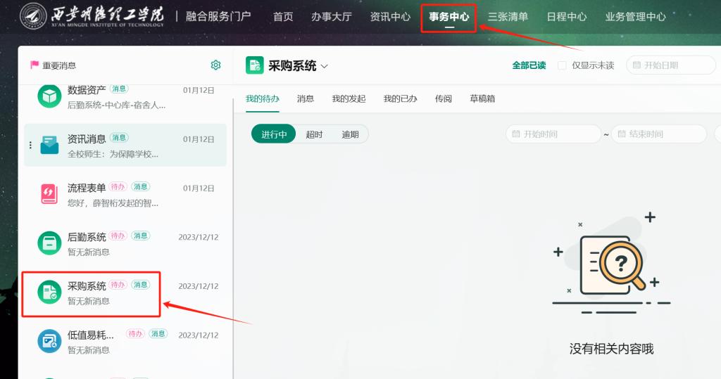 1.采购管理系统上线后,原OA系统中“采购模块”2024年1月22日起不再接收新业务申请,点击采供模块时将跳转到智慧校园融合服务门户登录页,统一使用采购管理系统进行采购申请、审批等相关业务处理。如需查看已办业务,继续登录原OA。