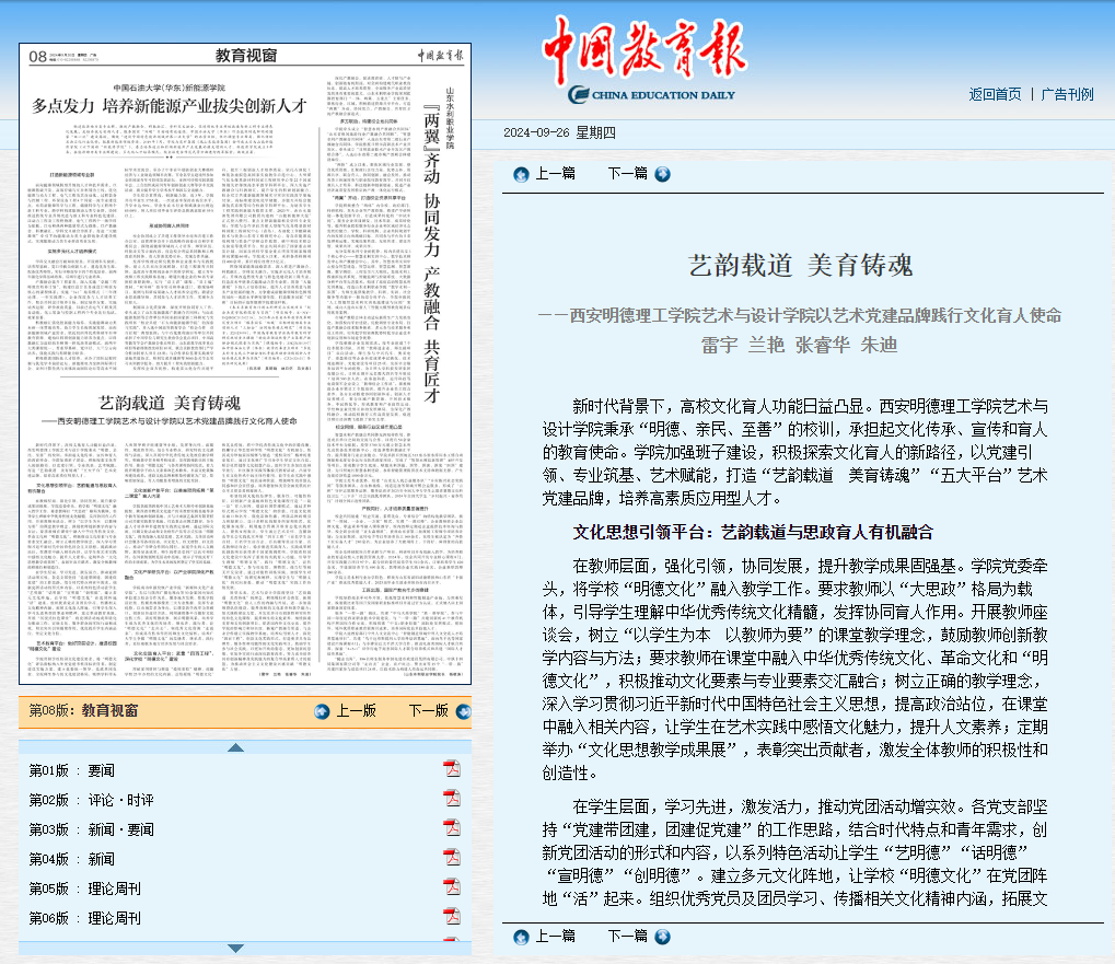 在新时代的教育背景下,高校艺术院系党建工作品牌的建立对文化育人工作提供了新渠道,在以文化人、以文育人实践中增强党支部的战斗力。开元艺术与设计学院以艺术党建品牌为引领,积极践行文化育人的使命。通过深度融合党建与艺术教育,把党的建设融入学院教育教学和立德树人全过程,打造“艺韵载道 美育铸魂”“五大平台”艺术党建品牌,取得显著成效。近日,《中国教育报》以《艺韵载道 美育铸魂——Ky开元集团艺术与设计学院以艺术党建品牌践行文化育人使命》为题,对学院艺术党建品牌践行文化育人使命进行全面报道。