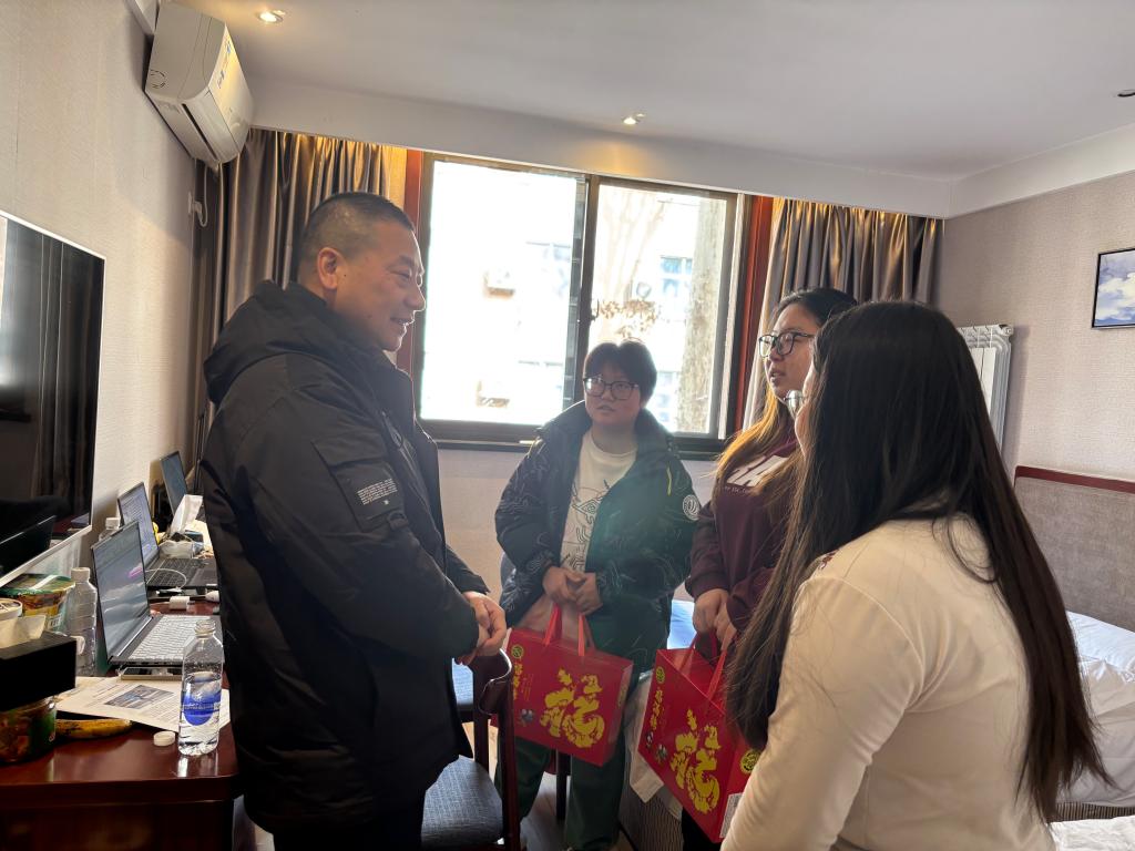 本次竞赛受到了学校领导的高度重视。1月26日,临近春节,副校长朱延波亲临竞赛现场,向辛勤备战的师生们致以亲切的慰问。适逢佳节前夕,朱校长贴心地为学生们准备了满载祝福的新年大礼包,不仅温暖了人心,更激发了大家的参赛热情。他细致入微地询问了学生们竞赛的进展情况,了解赛题的难易程度,并关切地询问了竞赛结束后学生们的返乡安排。朱校长鼓励学生们要勇于面对挑战,克服一切困难,全力以赴完成竞赛任务。他预祝每位参赛同学都能在竞赛中发挥出色,实现自我突破,收获佳绩,让这个春节因为努力与成就而更加意义非凡。