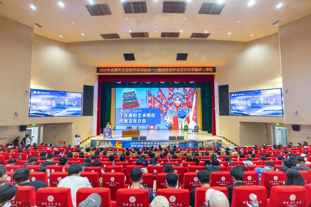 5月16日,由学校团委、马克思主义学院联合主办的高雅艺术进校园系列活动——西安易俗社走进明德理工在学校四季廊桥报告厅举办。西安演艺集团副总经理、国家一级演员、党的二十大代表、全国劳动模范、全国三八红旗手标兵惠敏莉受邀为学员作了“千年秦腔艺术唱出民族文化自信”的专题报告。学校党委书记马川鑫,党委副书记、纪委书记白秦川,副校长林东、党委副书记、副校长刘星出席活动。相关职能部门和教辅单位、各学院负责人及1000余名师生代表参加活动。