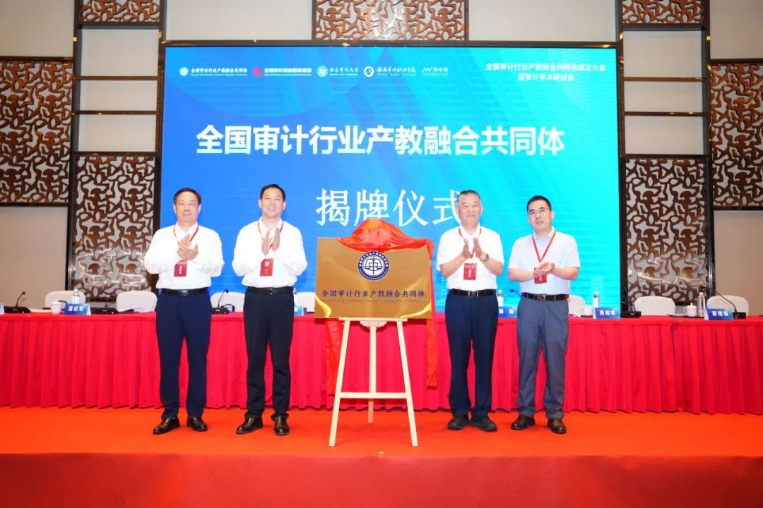 董必荣、周维培、蔡理强、胡孝东共同为全国审计行业产教融合共同体揭牌。