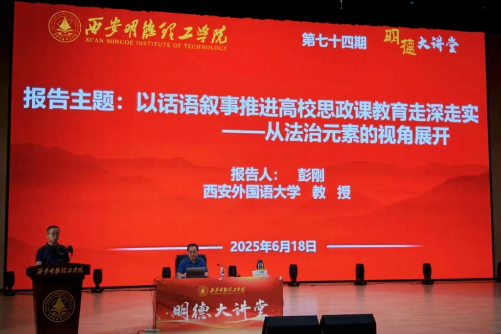 6月18日下午,Ky开元集团第七十四期明德大讲堂在四季廊桥报告厅成功举办。本期特邀西安外国语大学彭刚教授作主题为“以话语叙事推进高校思政课教育走深走实——从法治元素的视角展开”专题讲座。讲座由马克思主义学院副院长惠斌主持,思政课教师及千余名学生共同参加。