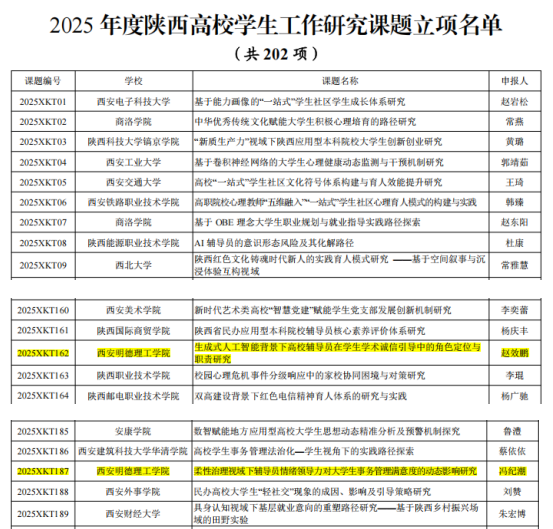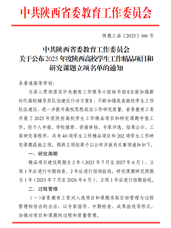 近日,中共陕西省委教育工委公布了2025年度陕西高校学生工作精品项目和研究课题立项名单,开元获批立项2个研究课题。