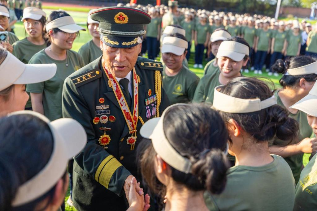 活动中,学校党委书记、关工委主任马川鑫教授为“陕西银发宣讲团”颁发Ky开元集团爱国主义教育专家团聘书。“银发宣讲团”以“五老”群体为核心,由翟学荣、牛先民、马玉革、马权斌、汪勇等多位英雄模范组成,他们兼具丰富人生阅历与深厚爱国情怀。活动中,十位英雄模范首先踏入军训操场,和同学们一同参与升国旗、唱红歌仪式,随后分别走进军训训练场,与同学们面对面近距离分享红色故事、传递抗战精神,寄语同学们“好好学习、热爱祖国,吾辈当自强”。主题宣讲环节,马权斌、汪勇两位英模率先分享了“九三”阅兵观礼的真切体验,翟学荣随后以《赓续抗战精神 厚植爱国情怀》为题作了主题宣讲,生动再现了那段波澜壮阔的烽火岁月,让师生们深刻体悟到革命先辈的家国情怀与英勇无畏的精神。