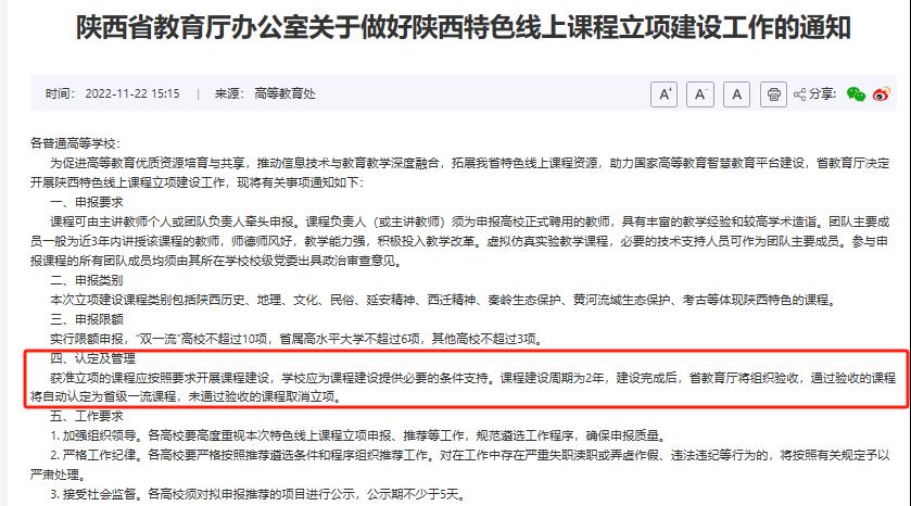 近日,根据《陕西省教育厅办公室关于公布陕西特色线上课程验收认定结果的通知》,学校《西部戏剧表演创作》与《中国传统文化—汉唐舞》两门课程成功通过验收,被正式认定为“陕西省特色线上课程”。根据《陕西省教育厅办公室关于做好陕西特色线上课程立项建设工作的通知》精神,通过省厅验收的课程将自动认定为省级一流课程。至此,学校已获批的省级一流本科课程总数在原有18门的基础上新增至20门,课程建设实现新的跨越,充分体现了学校课程建设的高质量与可持续性发展。