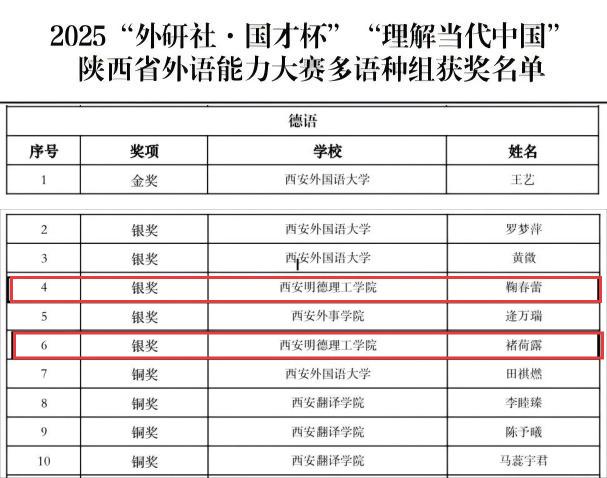 10月18日,在校赛中获得金奖的两位同学鞠春蕾与褚荷露晋级参加了多语种组省赛,二人均获得了德语组银奖。此次获奖充分彰显了我院德语专业在外语教学与人才培养方面的雄厚实力,以及学生们扎实的语言功底、深刻的思辨能力和出色的跨文化沟通能力。