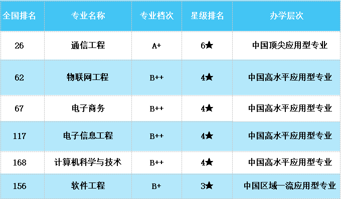 本次排名中,学院通信工程专业荣获A+评级,位列全国应用型大学第26名,获评6★“中国顶尖应用型专业”,成为学院专业建设的标杆。计算机科学与技术、电子信息工程、物联网工程、电子商务四个专业均获评B++等级和4★“中国高水平应用型专业”,软件工程专业获评B+等级和3★“中国区域一流应用型专业”。学院八个本科专业中,除两个新设专业外,其余六个专业悉数上榜,覆盖了多个关键信息技术领域,形成了较强的专业集群优势。
