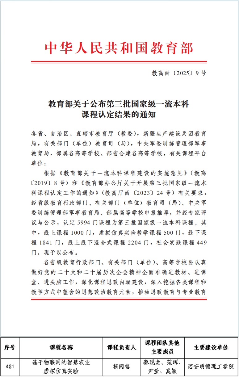 近日,教育部发布《关于公布第三批国家级一流本科课程认定结果的通知》(教高函〔2025〕9号),开元杨园格老师主持的《基于物联网的智慧农业虚拟仿真实验》课程成功入选第三批国家级一流本科课程(虚拟仿真实验教学一流课程),特此向全校师生报喜!